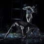 “It’s a dialogue between bodies and space, between figures with animal features and new technologies referencing a primordial and primitive instinct: what dominates is an astral and severe presence.”